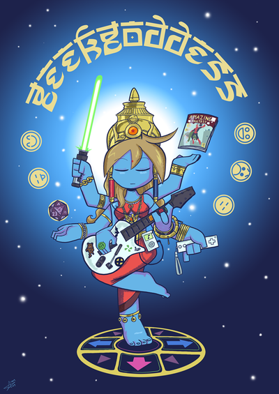 Dios, ¡si yo tenía pensado algo similar para un dibujo de mi musa! Saldría tocando la guitarra de GH y bailando en el DDR. Aquí se nota la diferencia de quien ha estudiado de esto y quien no, porque jamás se me había pasado por la cabeza dibujarla rollo Shiva.