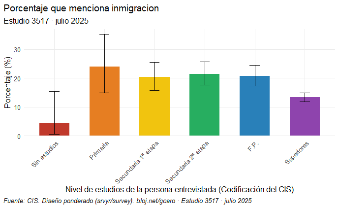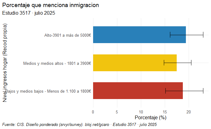 Aquí he agrupado a quienes, en una escala de 1 a 10 —siendo 1 izquierda y 10 derecha—, respondían de 1 a 4 (izquierda), 5-6 (centro) y 7 a 10 (derecha). En el gráfico se observa una relación clara entre ideología y percepción sobre la inmigración: cuanto más a la derecha se sitúa alguien en la escala ideológica, más probable es que considere la inmigración como uno de los principales problemas del país. De hecho, un test de tendencia que hice con R muestra que el efecto no es pequeño: por cada punto que una persona se desplaza hacia la derecha, la probabilidad de verlo como un problema aumenta en torno a un 20 %. (Al principio la probabilidad es muy baja y, con cada punto hacia la derecha, ese aumento se va acumulando sobre los anteriores)