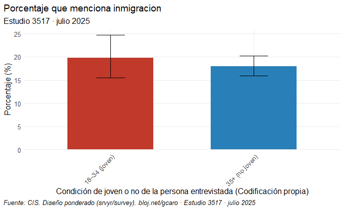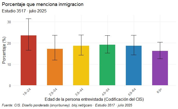 Podemos ver que, efectivamente, el grupo de 18 a 24 años muestra una mayor preocupación que los otros grupos de edad, con hasta 7 puntos de diferencia respecto al grupo de 65 o más años (23,5 % lo menciona frente a 16,2 %). No obstante, el número de casos no es muy grande (252 entrevistas de un total de algo más de 4000) y en el gráfico se aprecia un intervalo de confianza demasiado amplio como para sacar conclusiones taxativas. Además, la chi cuadrado no es significativa (0,549), de nuevo muy lejos del 0,05 que la haría significativa.