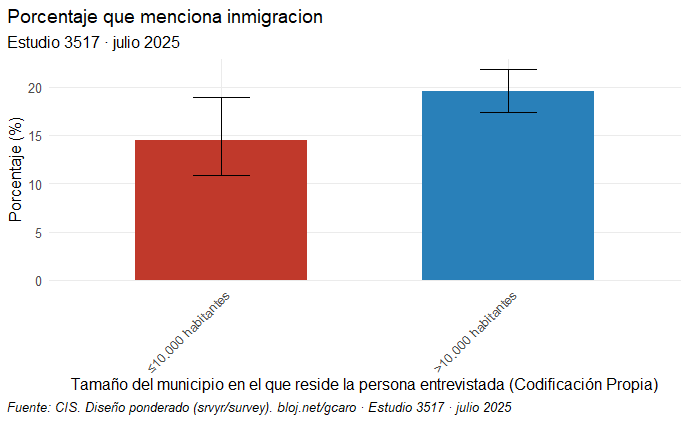 La diferencia entre ambos bloques es de 5 puntos; los intervalos de confianza son razonables y la ji cuadrado indica que la diferencia es estadísticamente significativa (p = 0,03926). Aquí puede haber dos explicaciones, que no son excluyentes. Por un lado, estos municipios están necesitados de población, por lo que pueden considerar una oportunidad la inmigración para resolver su problema demográfico. Por otro, los datos del INE muestran un porcentaje menor de personas migrantes en estas poblaciones, luego es algo más lejano y menos cotidiano. El porcentaje de población extranjera en España es de un 11,2 %, mientras que la horquilla en estos municipios va del 4,4 % en los de menos de 101 habitantes al 9,3 % en los que tienen entre 5001 y 10.000 habitantes.