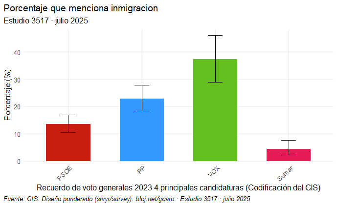 Si solo tienes unos minutos para leer este artículo, decirte que del análisis se desprende que la percepción de la inmigración en España como uno de los tres principales problemas tiene una fuerte correlación con la ideología (cuanto más a la derecha, más se percibe este asunto como uno de los principales problemas) y con el recuerdo de voto (los votantes de VOX son quienes más lo mencionan). No obstante, algo más del 10 % de los votantes del PSOE lo mencionaron también. Además, influye la situación laboral —quienes se encuentran en paro lo mencionan más— y también el nivel de estudios, ya que quienes tienen estudios superiores, especialmente universitarios, lo mencionaron menos.