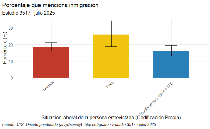 Vemos que quienes se encuentran en paro, tanto si trabajaron antes como si no, señalan más la inmigración como uno de los tres principales problemas del país. En cambio, las personas inactivas laboralmente —una categoría que incluye casuísticas muy diversas (estudiantes, mujeres dedicadas al trabajo doméstico no remunerado, jubiladas…)— son las que menos lo mencionan. Aquí, de nuevo, creo que el factor clave es que opera, al menos en parte, esa sensación de competencia por los puestos de trabajo. Es muy importante señalar que el hecho de que esa sea la percepción de una parte de la población no la hace cierta y que, de serlo, el encuadre correcto no sería percibir la inmigración como un problema, sino, por ejemplo, la necesidad de crear y repartir el empleo o la falta de vigilancia en el cumplimiento de la normativa laboral y la consecuente precarización.
